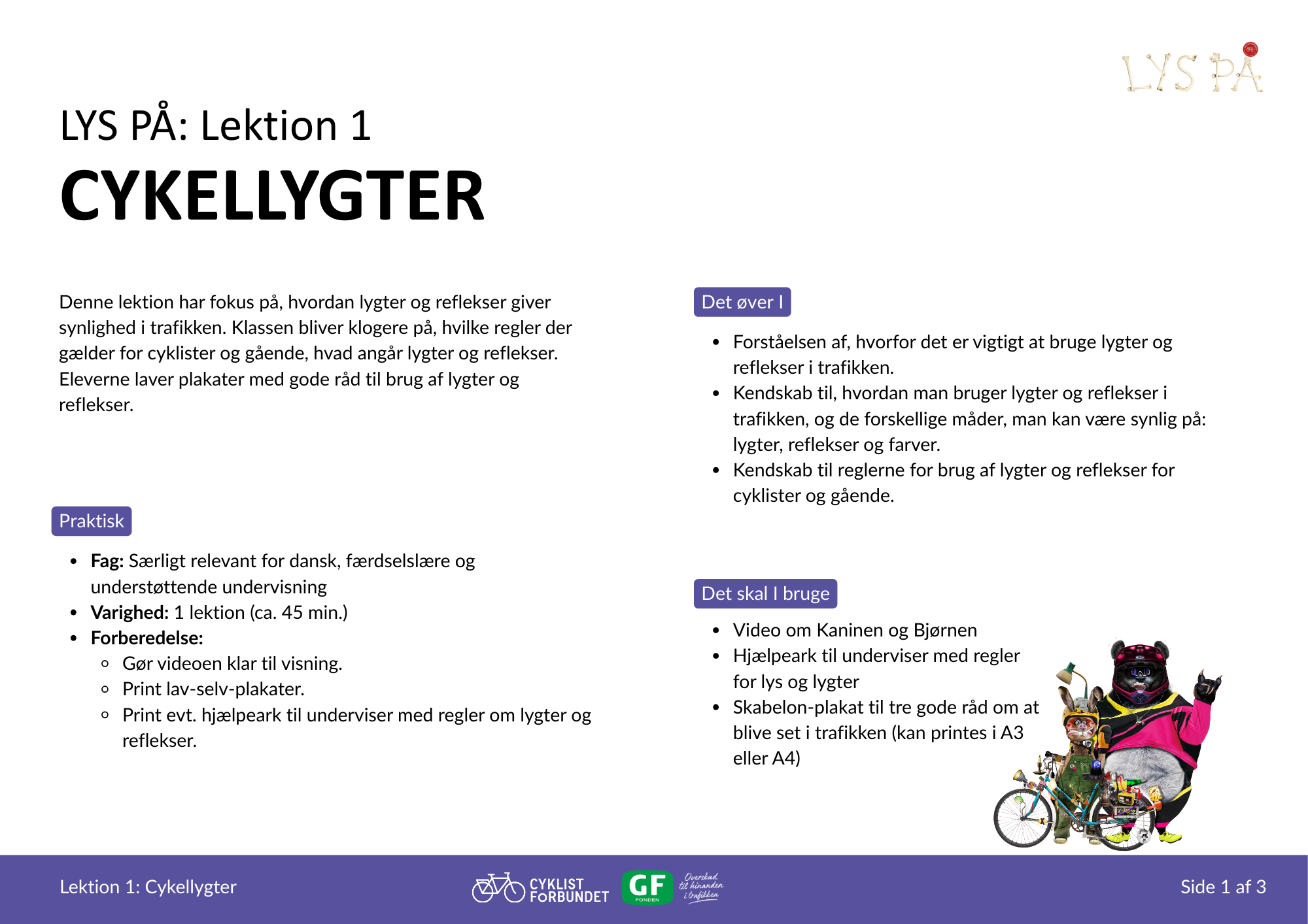 Denne lektion har fokus på, hvordan lygter og reflekser giver synlighed i trafikken. Klassen bliver klogere på, hvilke regler der gælder for cyklister og gående, hvad angår lygter og reflekser. Eleverne laver plakater med gode råd til brug af lygter og reflekser.