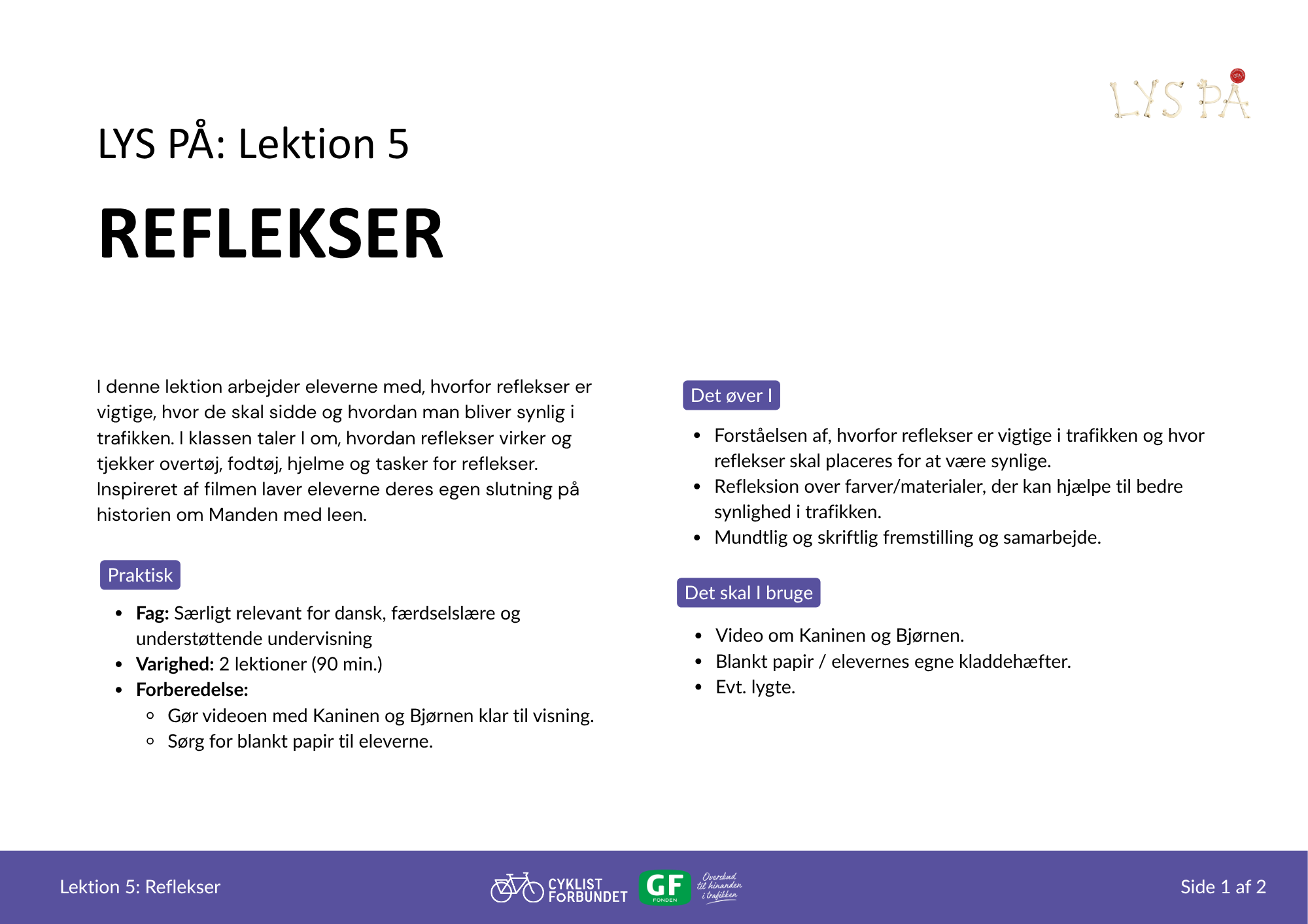 I denne lektion arbejder eleverne med, hvorfor reflekser er vigtige, hvor de skal sidde og hvordan man bliver synlig i trafikken. I klassen taler I om, hvordan reflekser virker og tjekker overtøj, fodtøj, hjelme og tasker for reflekser. Inspireret af filmen laver eleverne deres egen slutning på historien om Manden med leen.